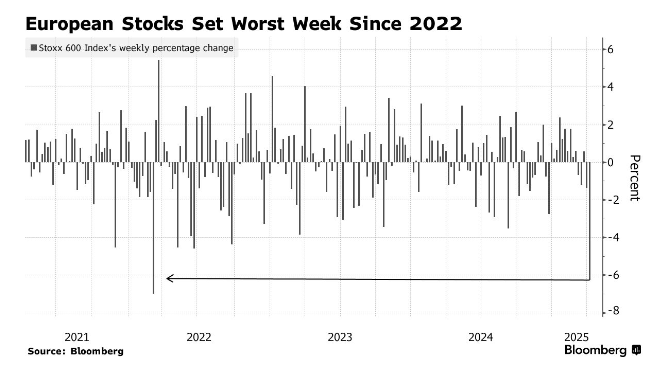 欧洲斯托克600指数本周累计跌幅达7%,为2022年3月以来最惨淡的单周表现。