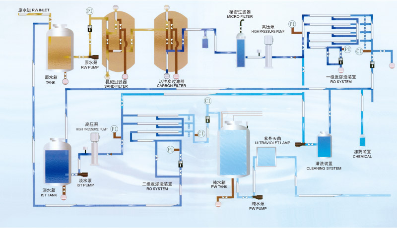 适用于纯净水、矿泉水、果汁含气饮料生产的各类水处理设备。主要包括:反渗透系统、钠滤器、超滤器、微孔过滤器、多介质过滤器、活性碳过滤器、离子交换器、臭氧设备等等。